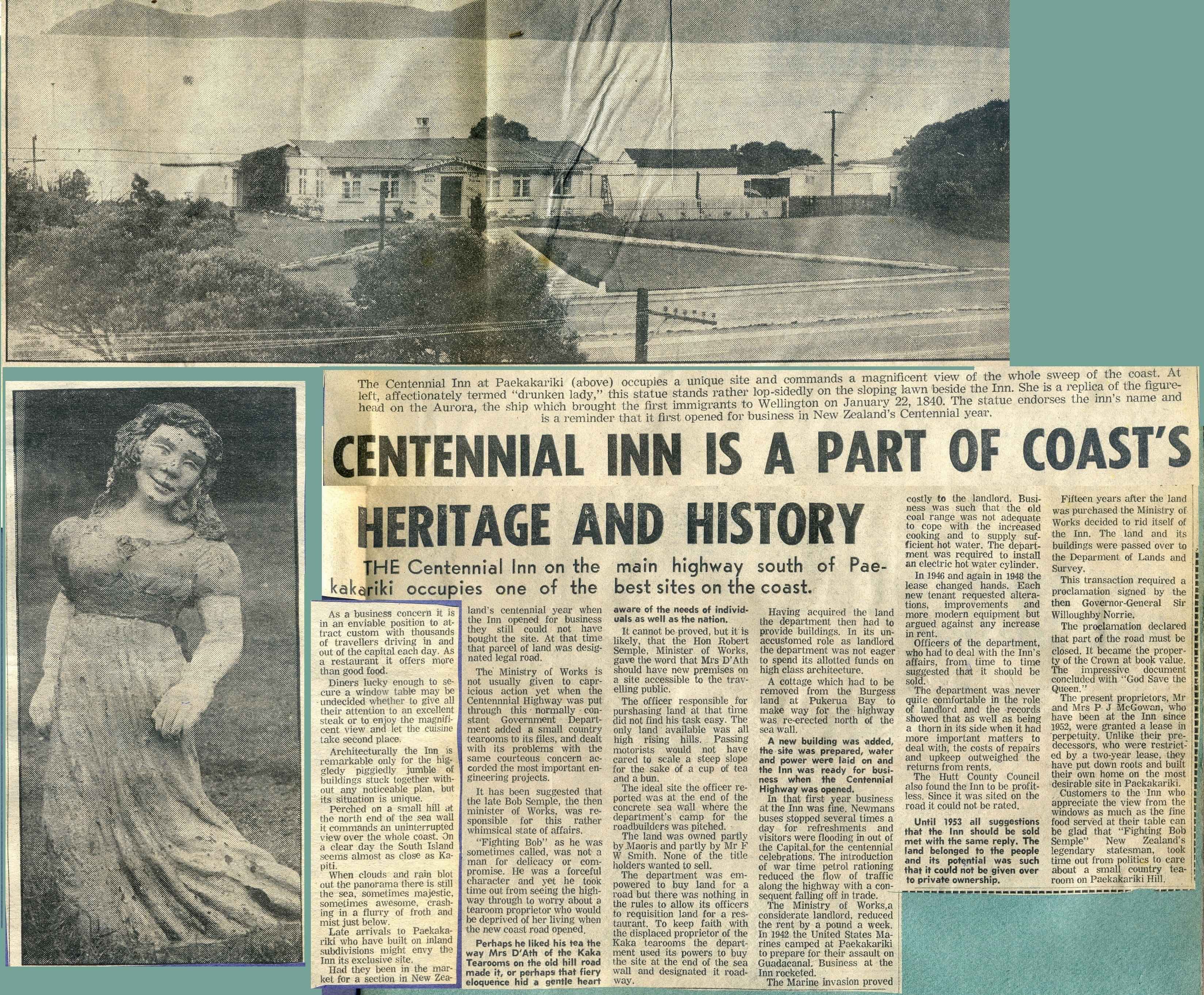 The Centennial Inn was constructed using an old cottage removed from Pukerua Bay to make room for the motorway, and parts of the old Kaka Tea Room.