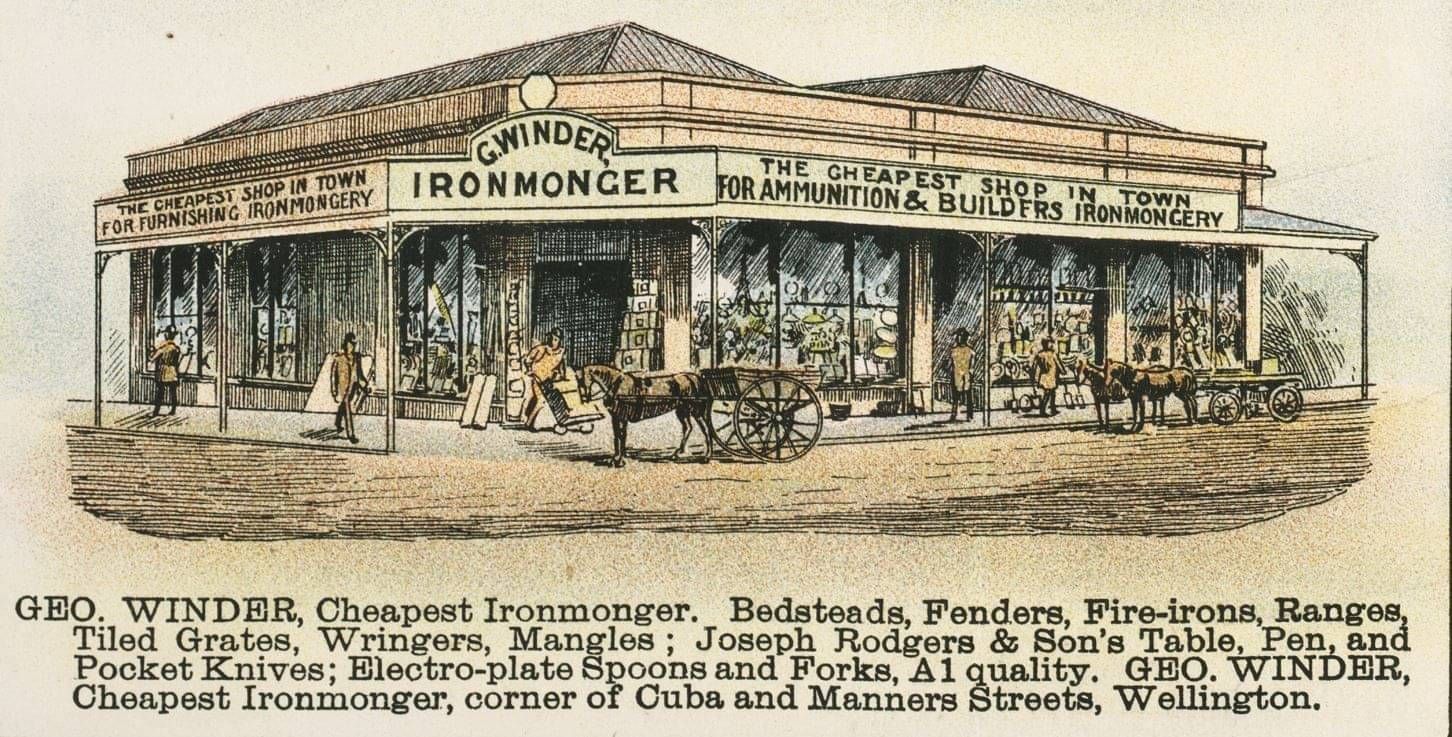 Poster showing the shop of Wellington Ironmonger on the corner of Cuba and Manners Streets, c. 1893.