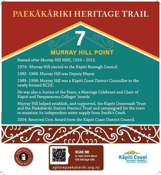 “Murray Hill Point” marks his more than three decades of local service to the Paekākāriki Community for which he received a Civic Award from the Kapiti Coast District Council in 2004.