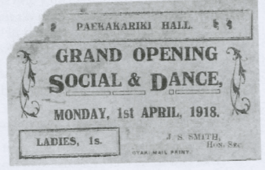 The hall was opened with a ”Social & Dance” on Easter Monday 1st April 1918. Opportunity was taken to “Farewell” young men from Paekākāriki who were in camp awaiting transport to go overseas to World War 1. Among these, was Mr. Wit Smith, second son of Mr. & Mrs. J.S. Smith.