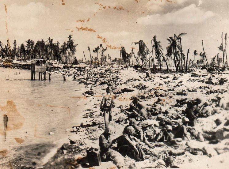 The Battle of Tarawa took place in November 1943. It was considered the bloodiest battle of the Pacific War. It is sometimes referred to as the American Gallipoli. The coral atoll of Tarawa (now the capital of the Republic of Kiribati) was an important strategic airbase, occupied by the Japanese. 18.000 Marines arrived at the atoll on November 19, 1943. On November 20 the Second Division launched what they thought would be a straightforward attack. The island was heavily fortified and defended by 4,690 Japanese and Korean troops. The tides were lower than expected, preventing a close landing. U.S. soldiers waded to shore chest-deep in water, soaking their equipment and losing radio communication. Many were killed or injured before arriving on the beach.